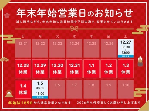 年末年始営業日のお知らせ